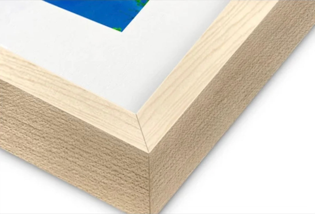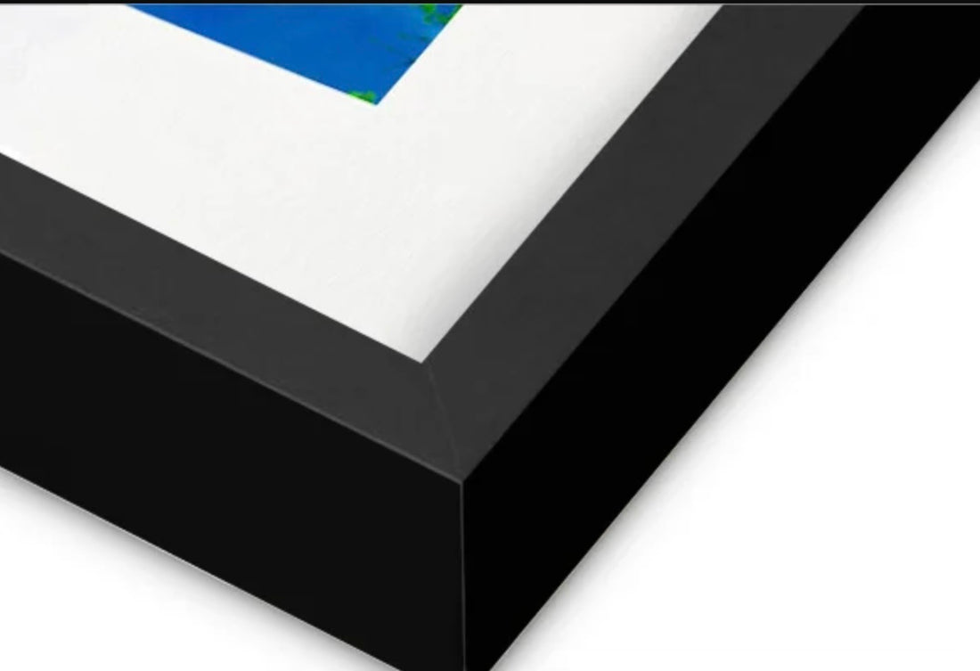 Each framed print is beautifully presented with a 3" natural white mat that enhances the artwork’s presence and depth. The elegant solid wood 2.25" tall frame with a 1" top profile makes a refined statement on any wall. Each print is mounted on foam core, protected by clear acrylic glazing for a polished, gallery-quality finish, and completed with a kraft paper backing and sturdy hanging wire; arriving ready to hang and enjoy the moment it’s unboxed.